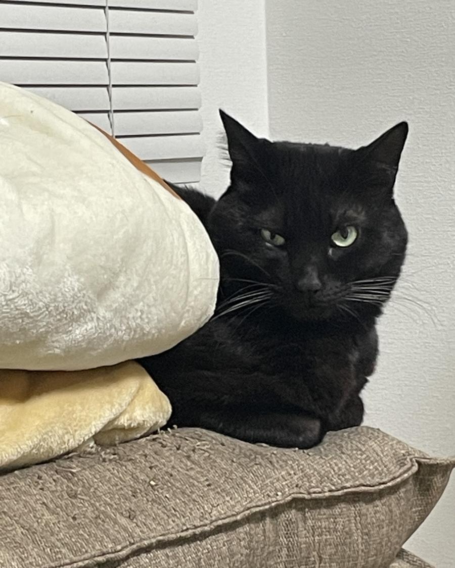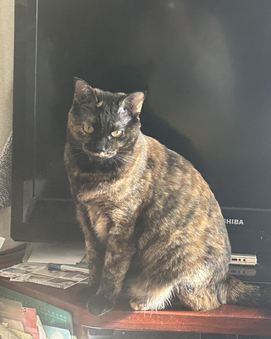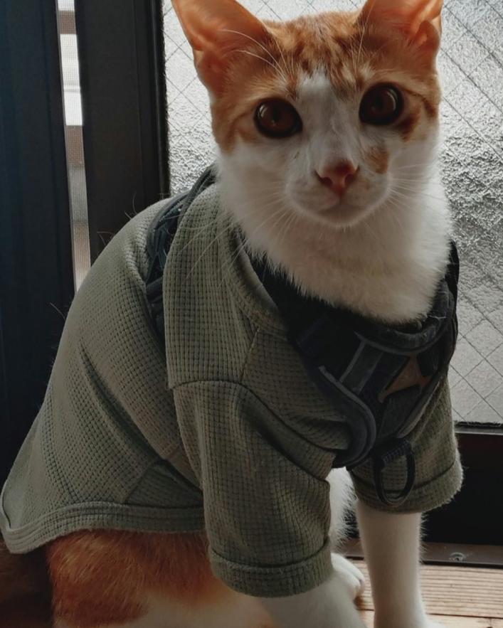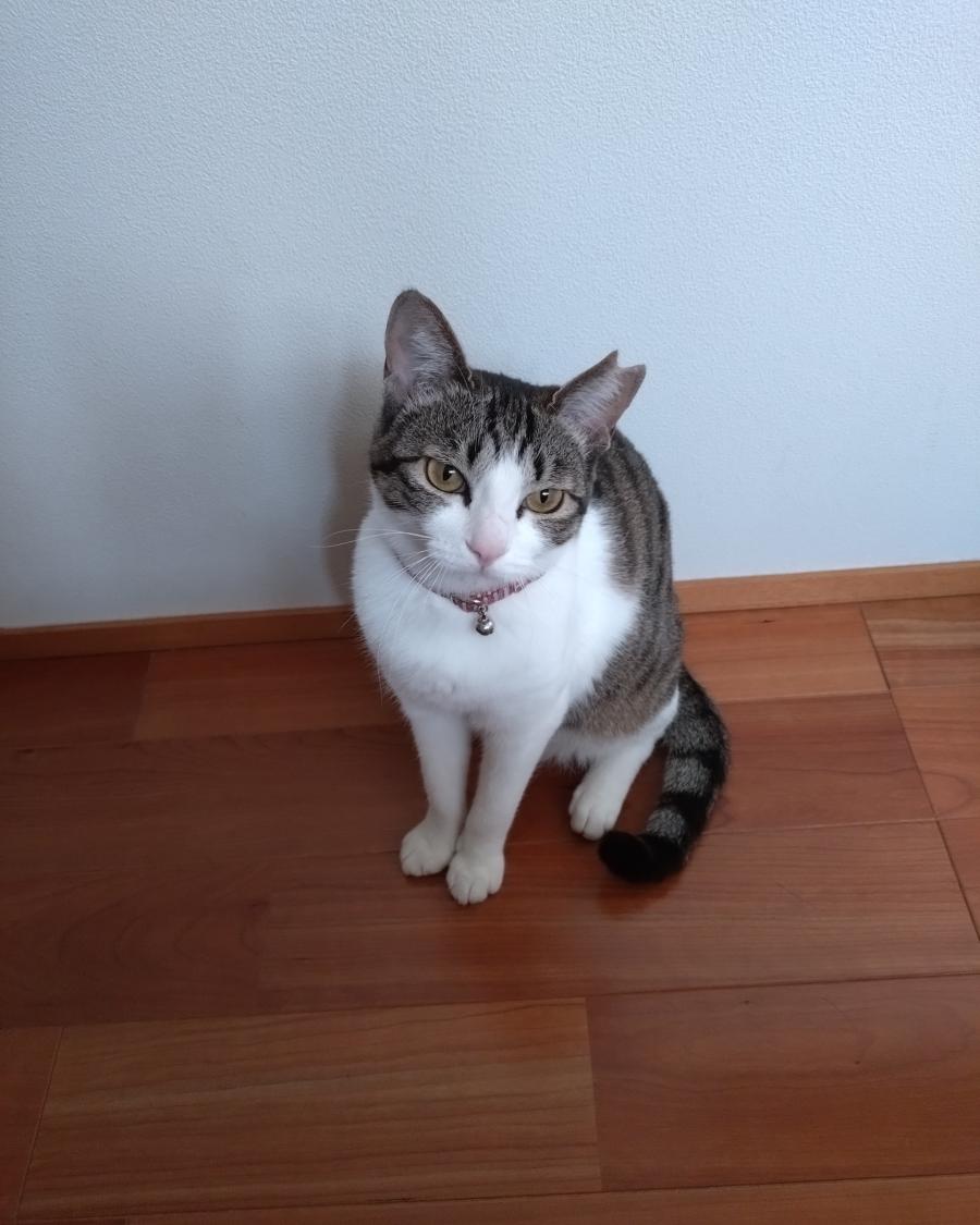 - 濃いめのキジトラ猫です。身体に対して少し顔が小さく目が丸く大きいです。目の色は少し緑がかっています。しっぽは長いです。人見知り。