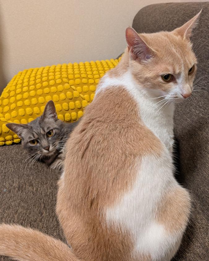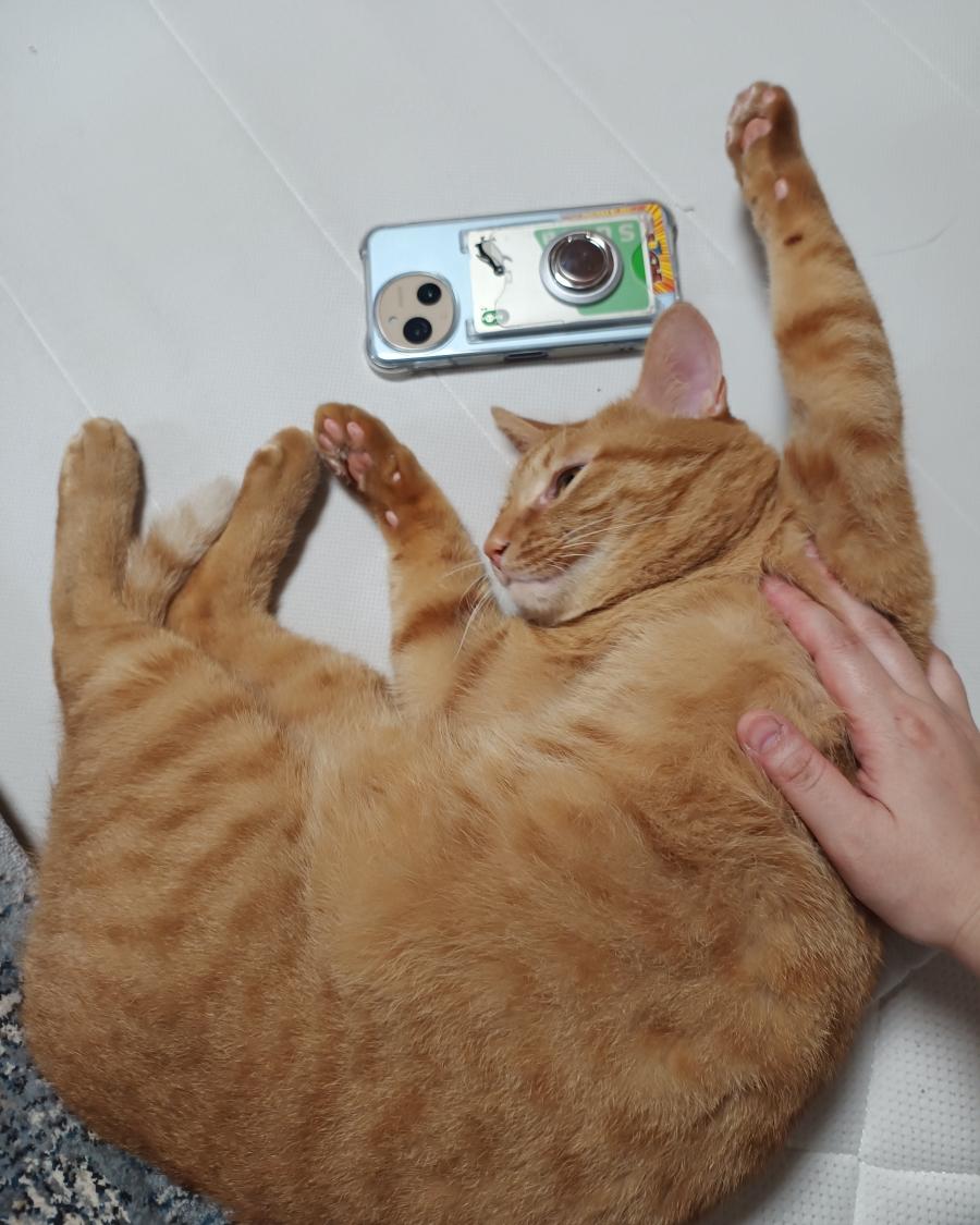 - お腹回りがぽっちゃりな茶白のメス猫です。