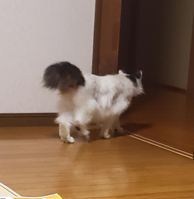- 白黒の長毛。シッポが黒色でボサボサ