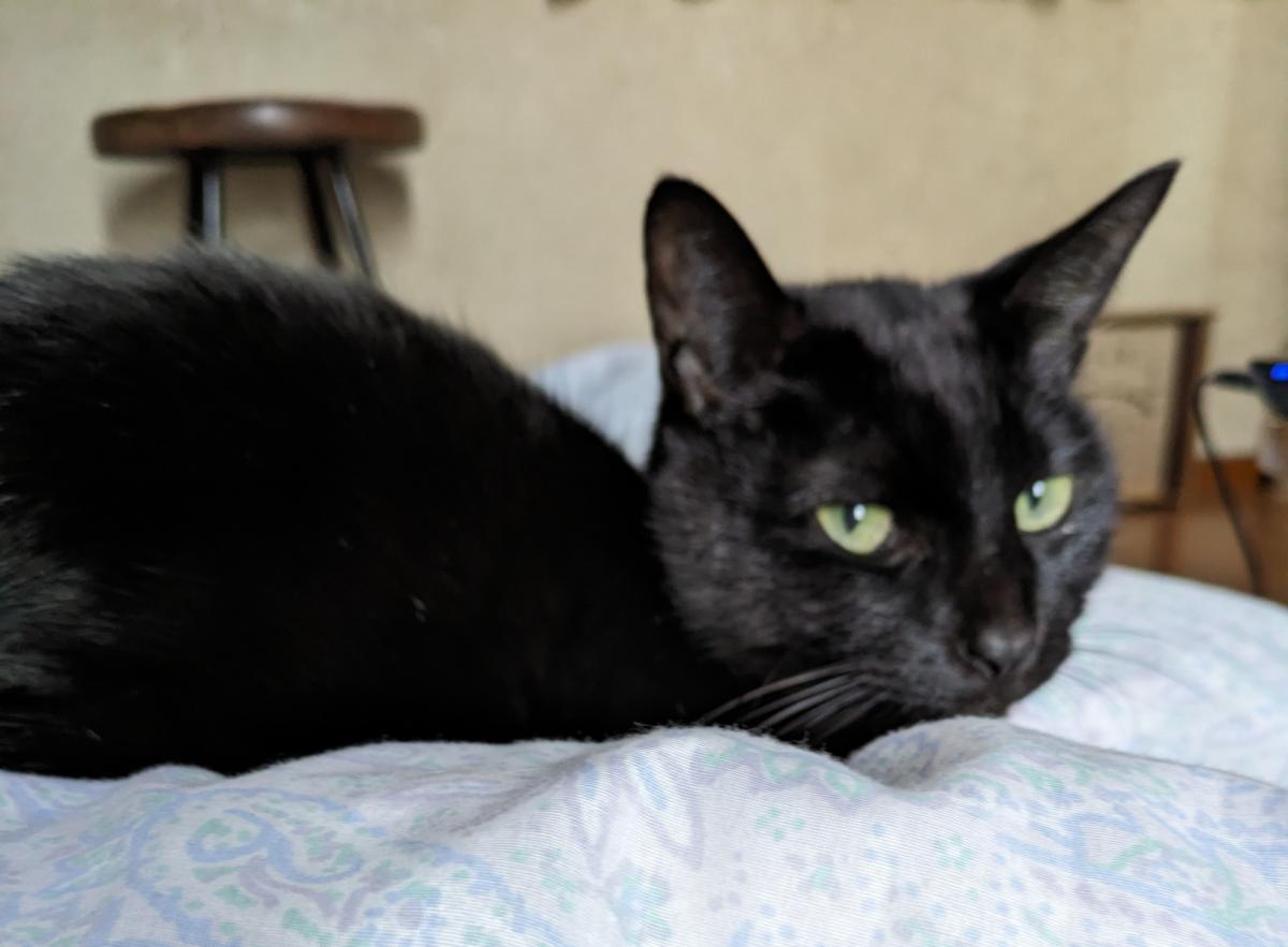 - 14歳です、痩せていますが、年の割に敏捷な黒ネコです。首輪と赤い散歩用のひもをつけています。