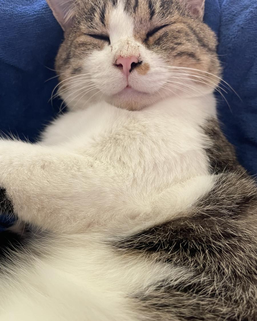 - 鼻の横に茶色の模様、左前足に柄が2つ