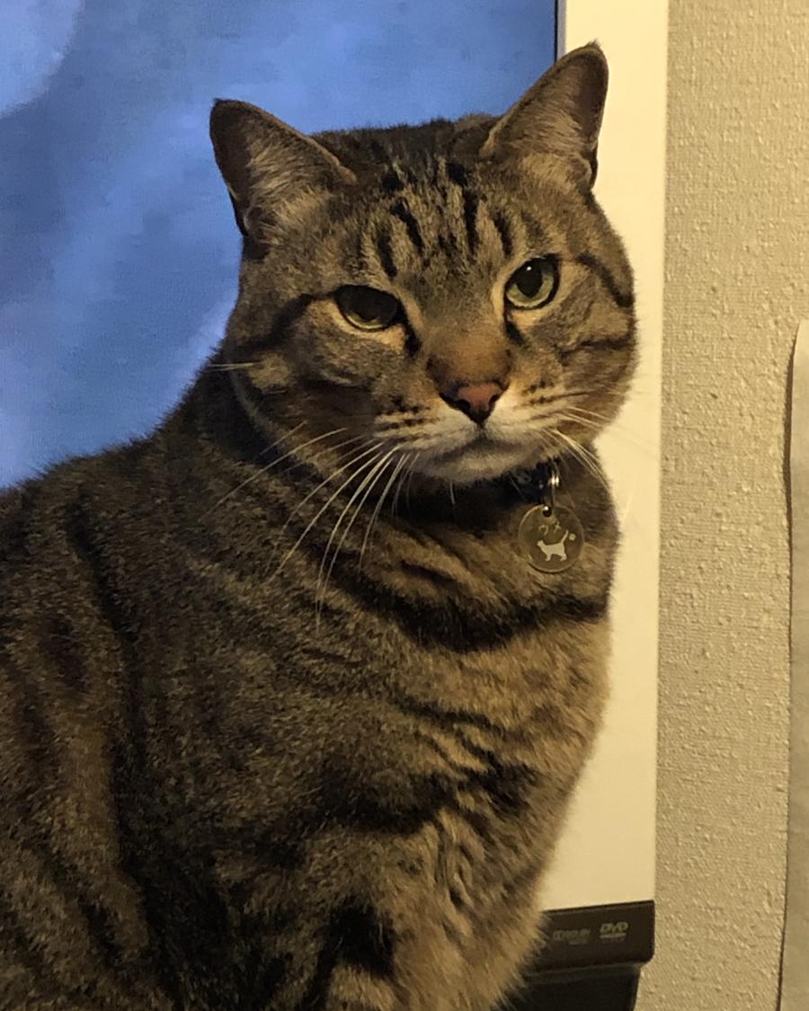 - 名前と連絡先が彫られた金色の迷子札首輪を付けています。青色帯、白いお魚柄、鈴なし。