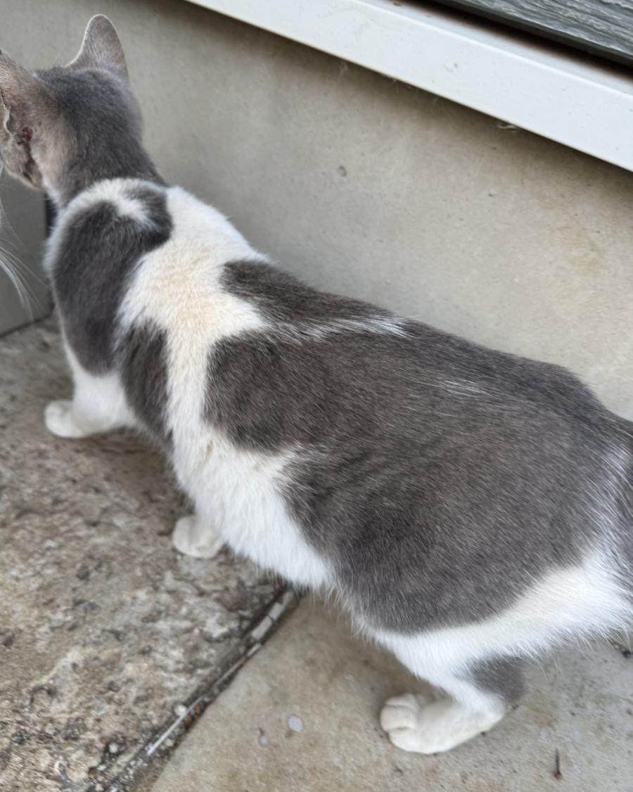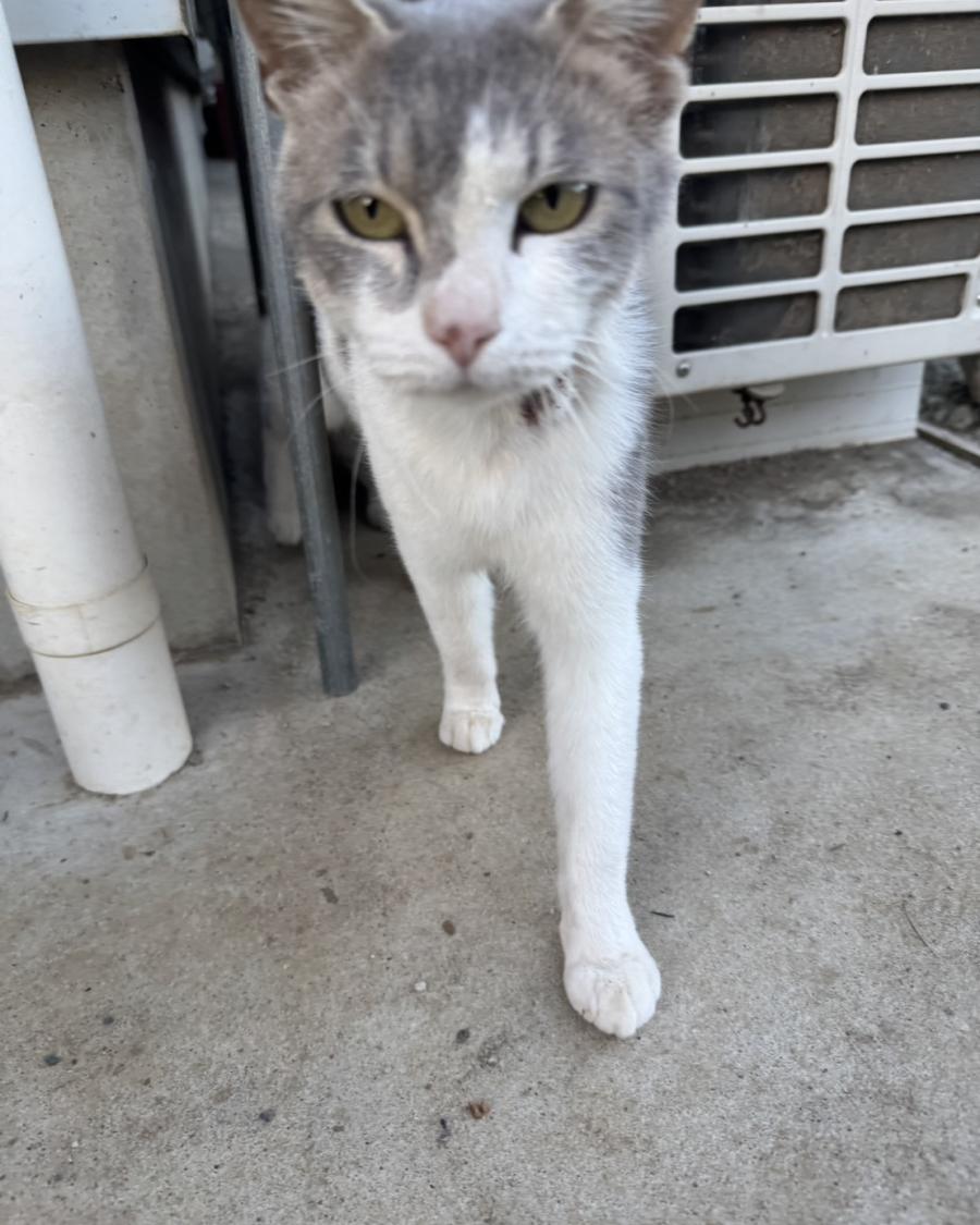 - 左側の顔から首にかけて皮膚の傷があるグレーのハチワレ♀を探しています!