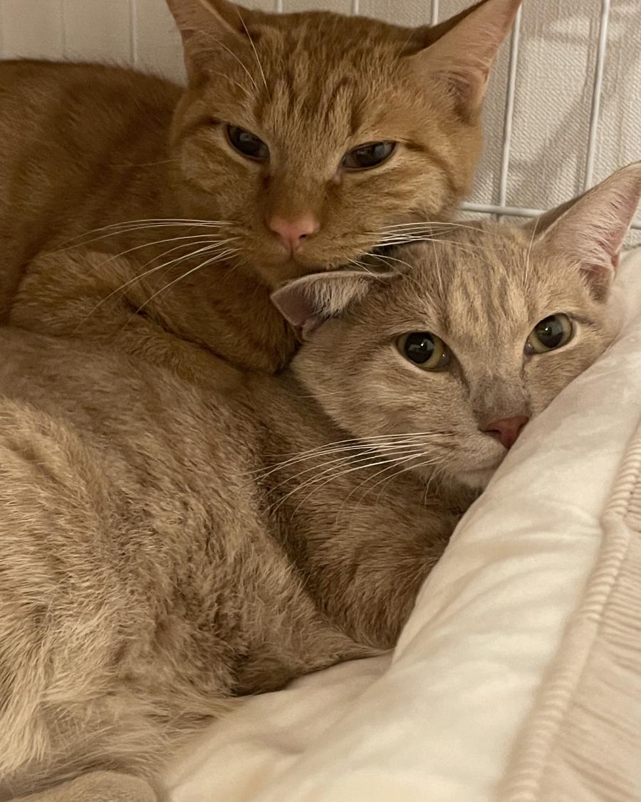 - 2匹とも全身茶トラで1匹は濃く、もう1匹は薄い茶色です