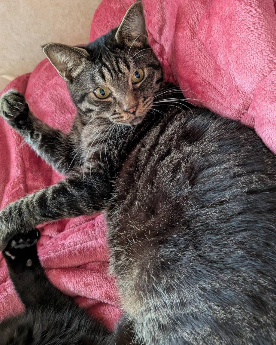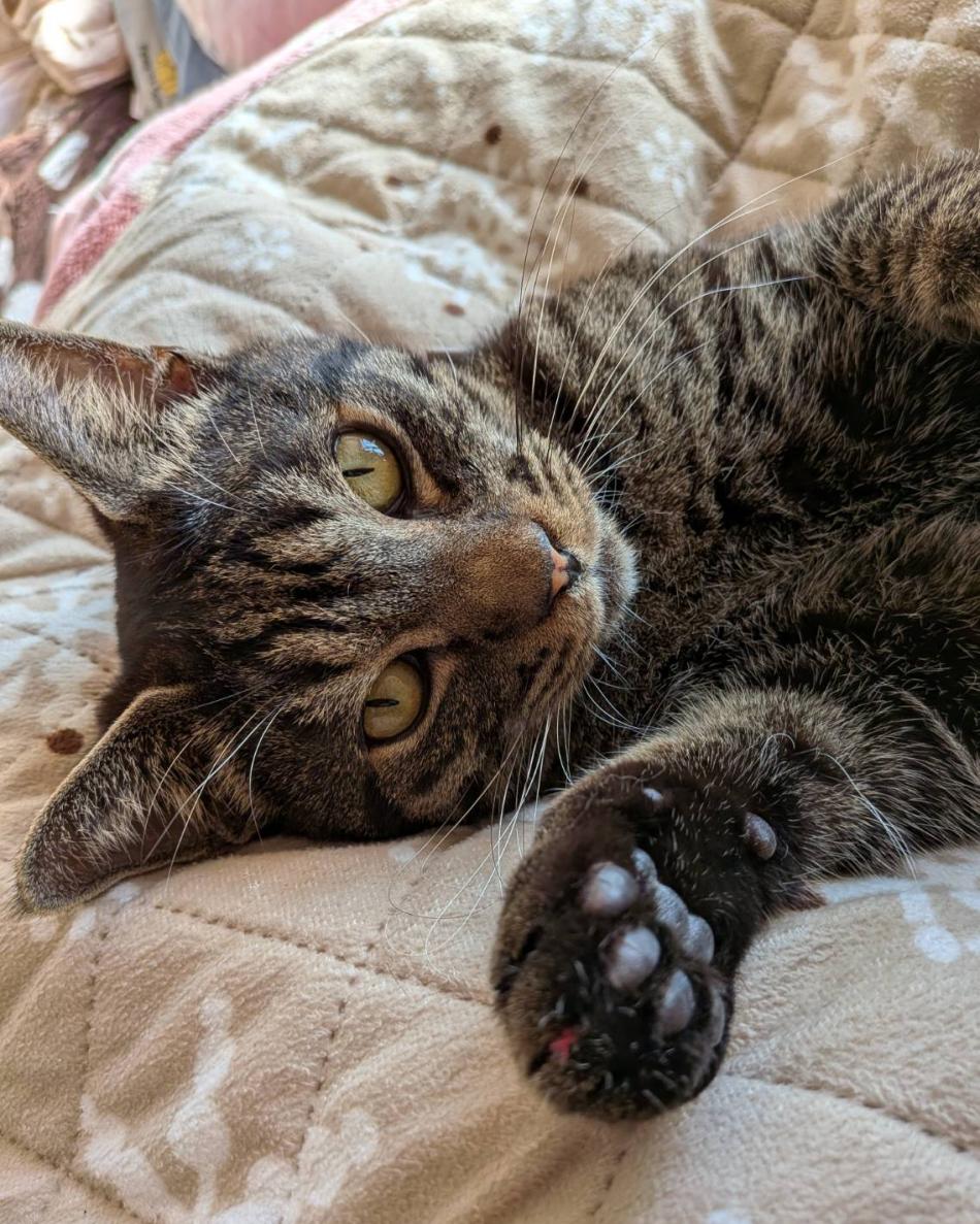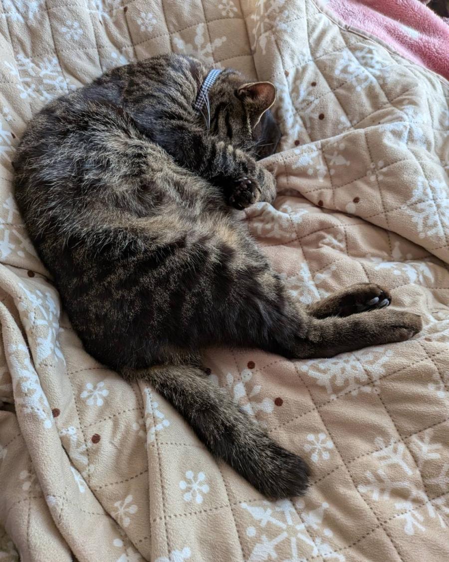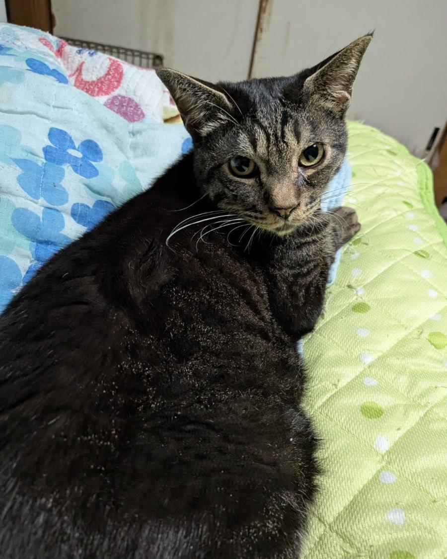 - ぽっちゃりしたトラ猫の男の子。声は高め。しっぽは太め、まっすぐ、長さは20cmくらい。おっとりしてひとなつっこい性格。