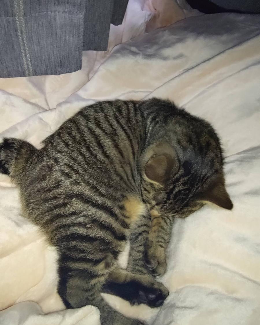 - 生後8ヶ月の去勢していない、しっぽが短くて丸いオス猫。