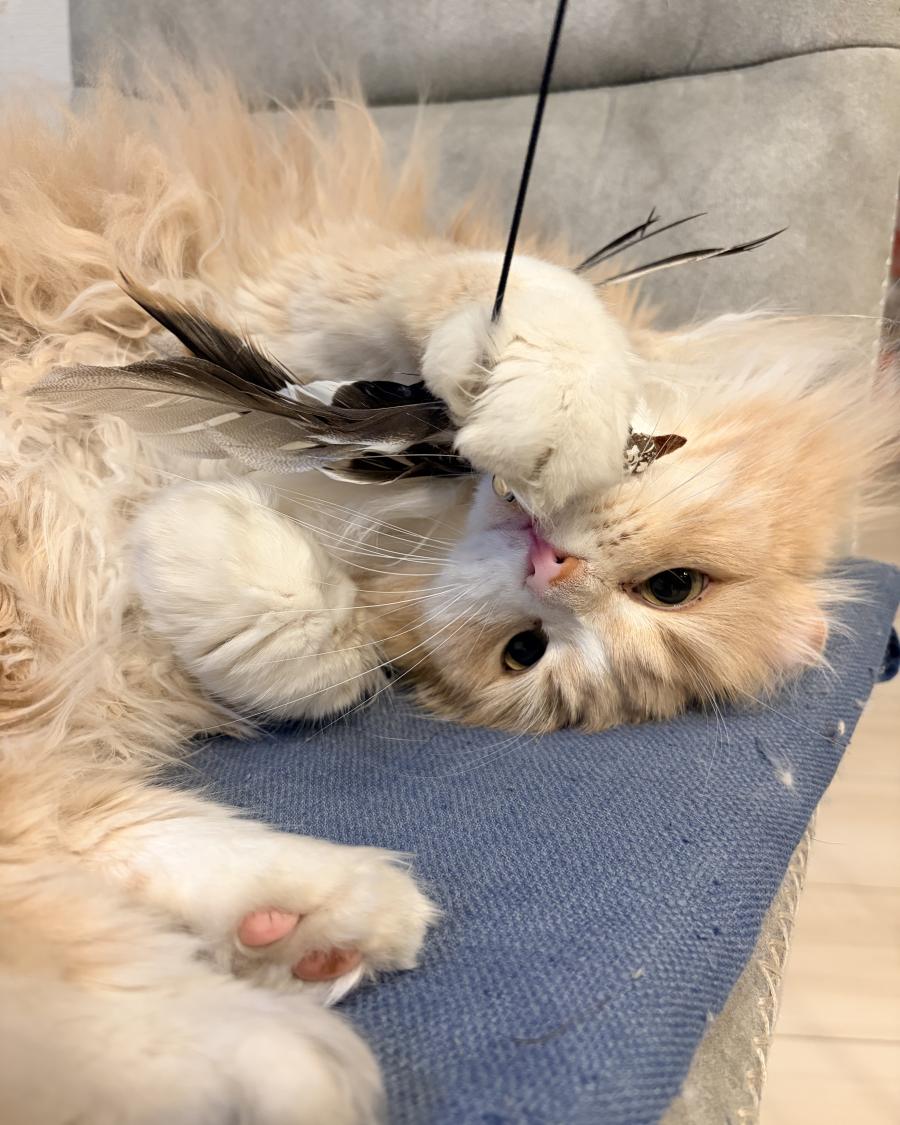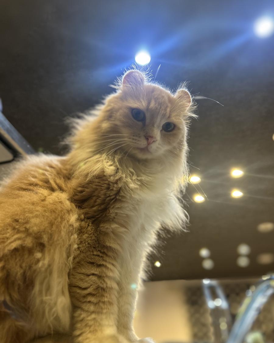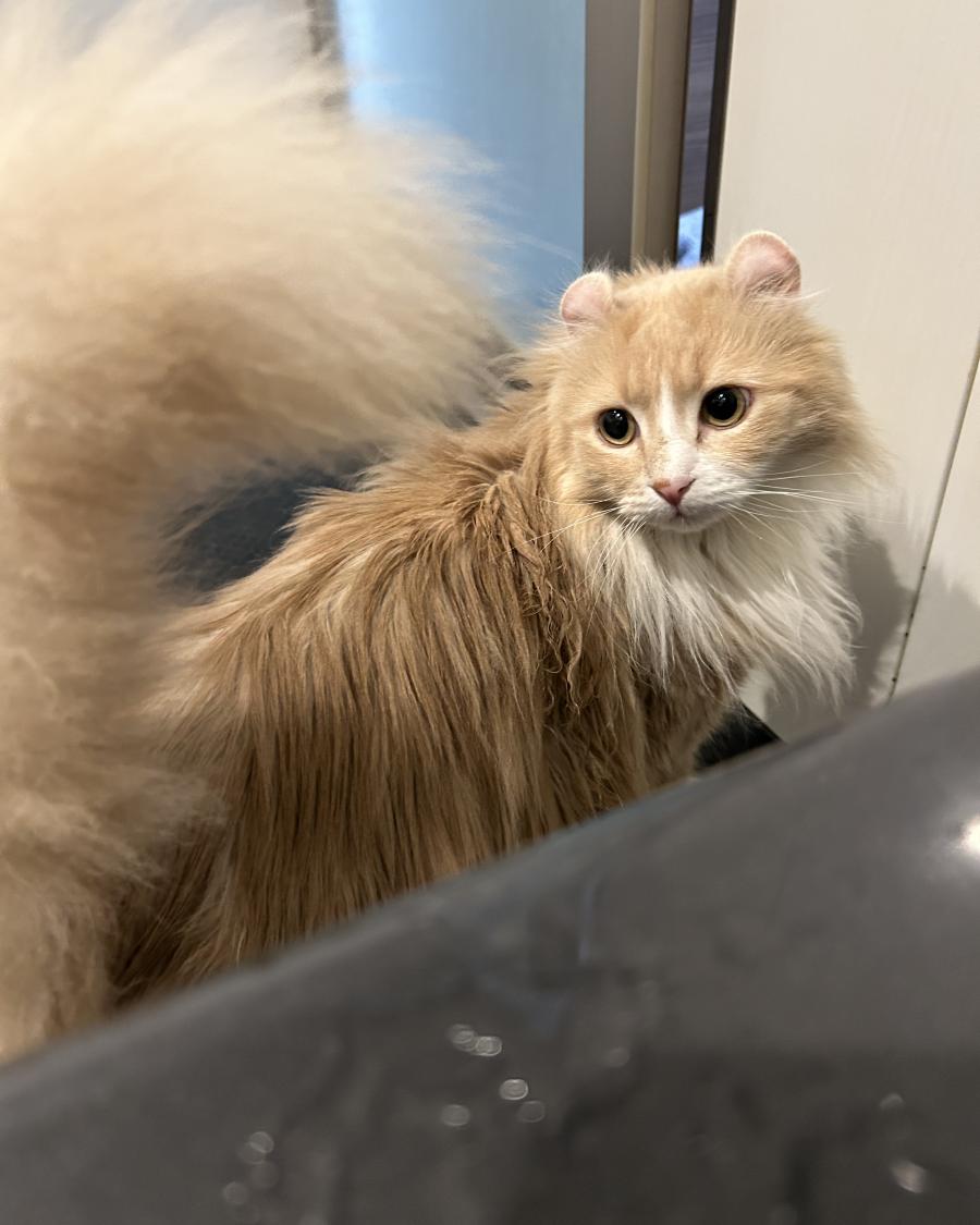 - 長毛でふわふわで耳が後ろにそり返ってる。首輪はしてない。
