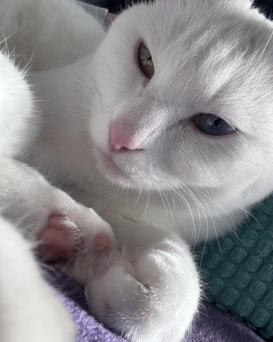 - 真っ白な白猫です。左目が青い。難聴で音に反応しません。左後ろ足に手術歴があり後ろから見ると左側の後ろ足が大きく見えます。