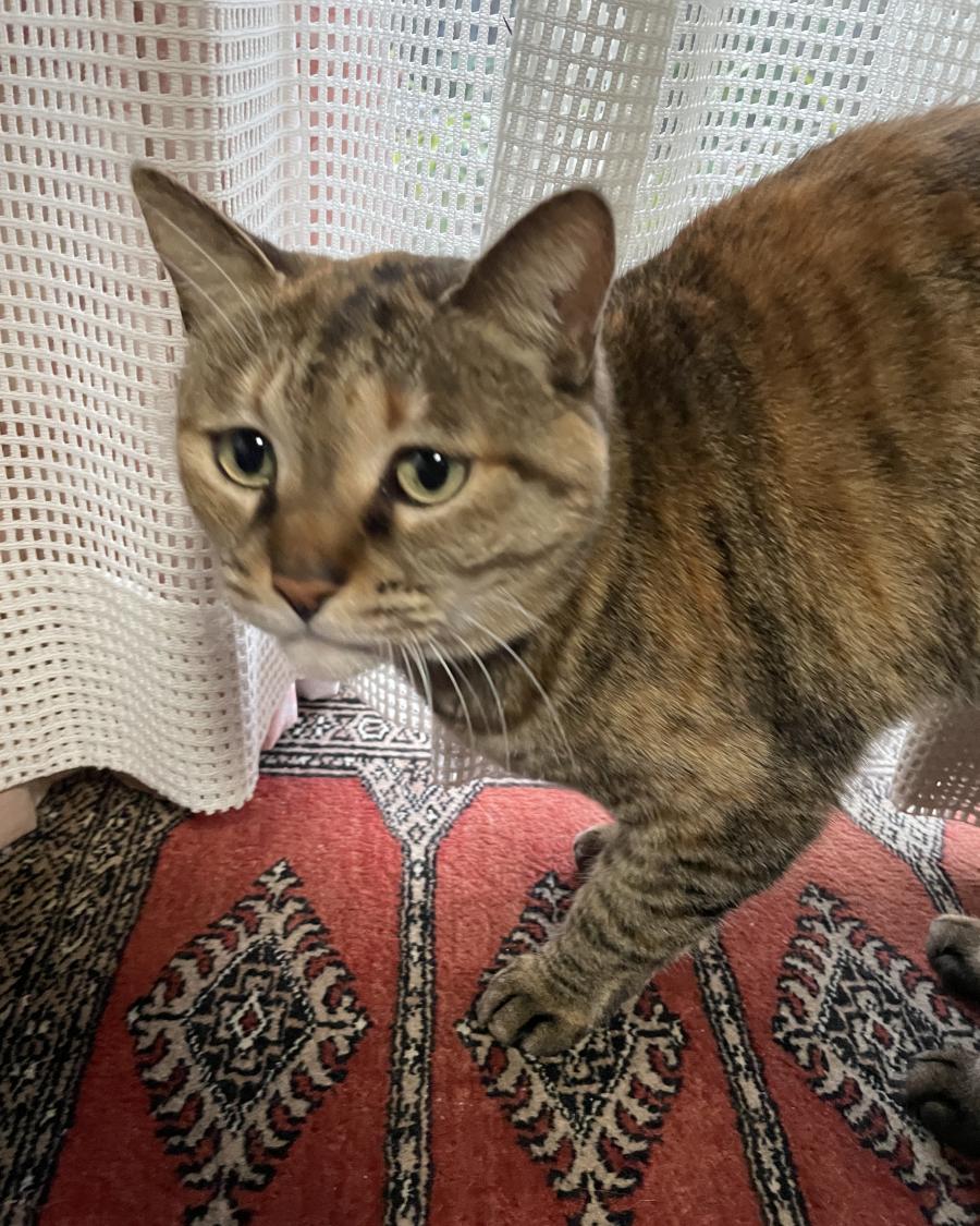 - 薄茶のトラネコ柄、首に鈴をつけています