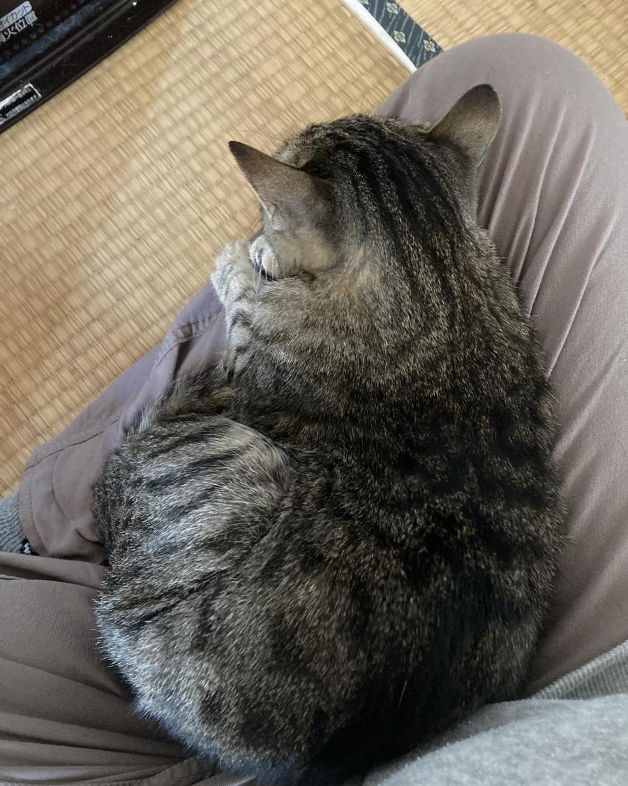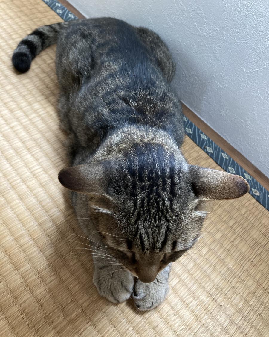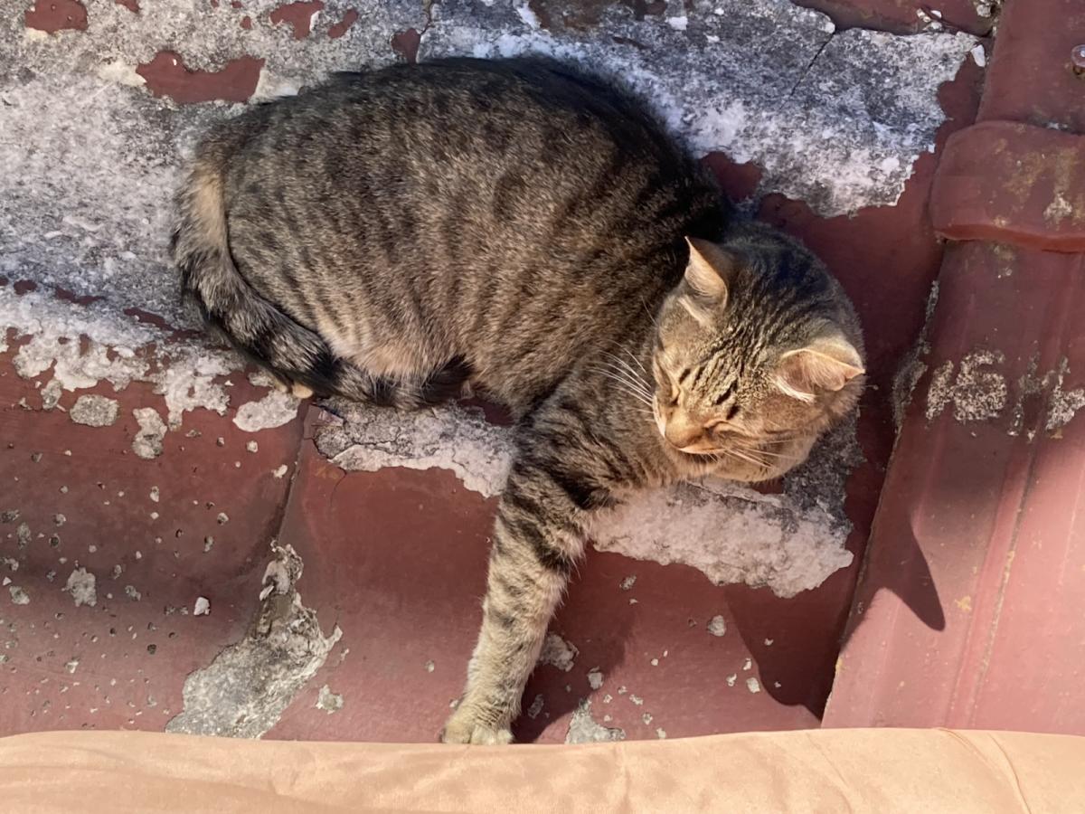 - キジトラ柄の中型でやや細身。しっぽは黒い縞がはっきり。耳は大きめで立ち気味、顔はやや丸く目を細めがち。首輪なし。去勢済みだが見た目は未去勢に見える。おとなしい性格。