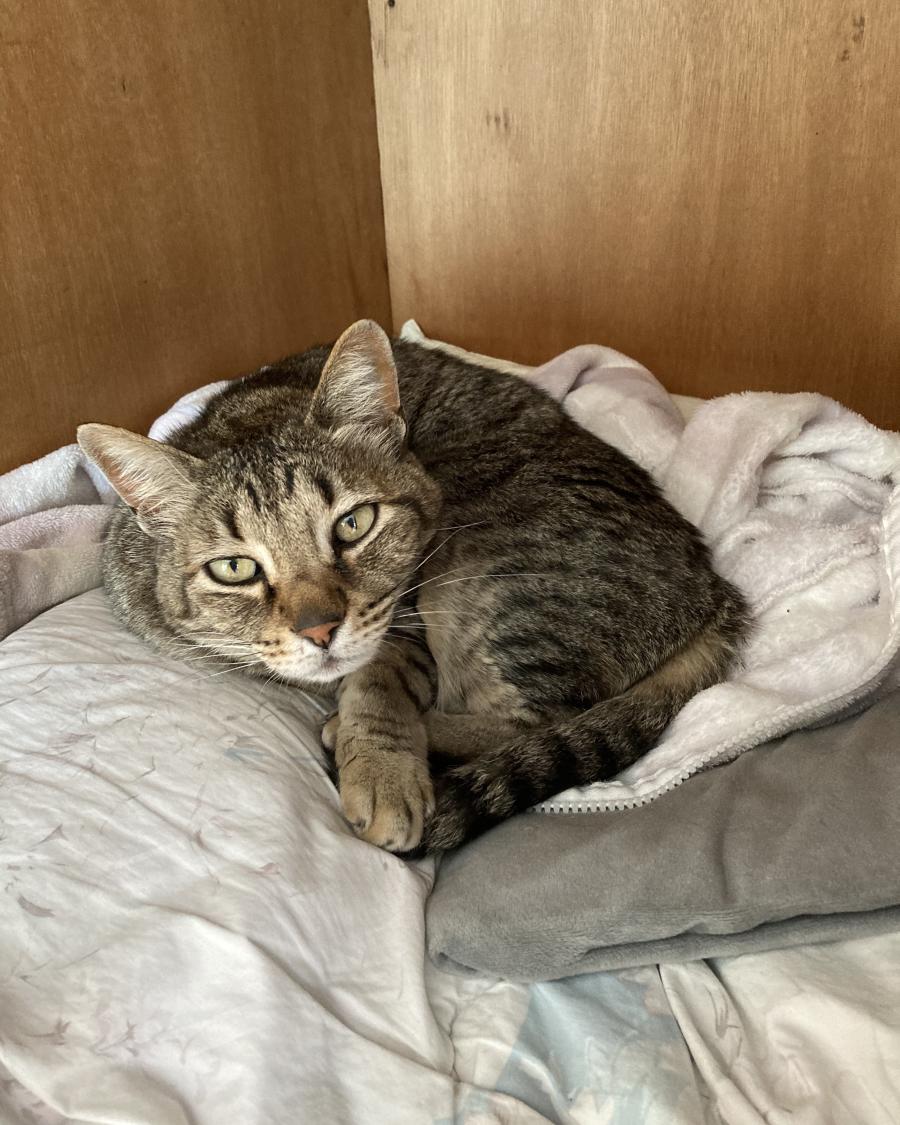 - キジトラ柄の中型でやや細身。首輪なし。おとなしい性格。
