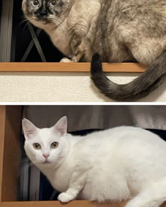 - 2匹とも長い尻尾、白猫は大柄、シャムに似てる柄