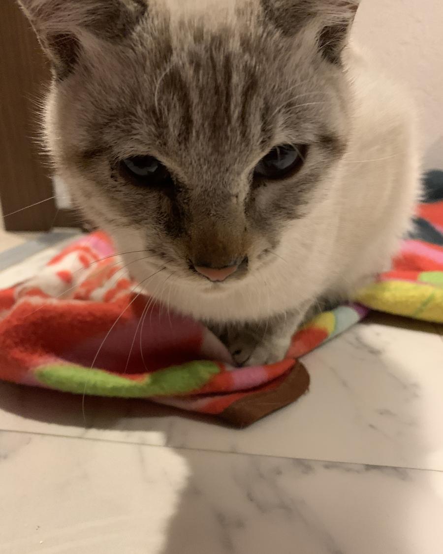 - キジ白、左前犬歯が歯茎に沿うように斜めに生えています
