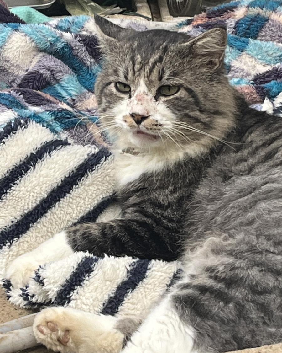 - グレーホワイトのハチワレ耳の上の毛が長い