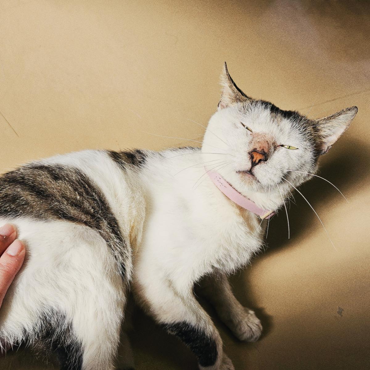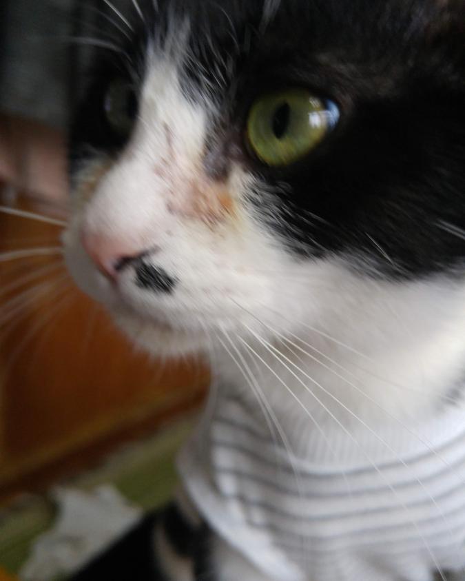 - ハチワレ、左脚のつけ根に白い白線