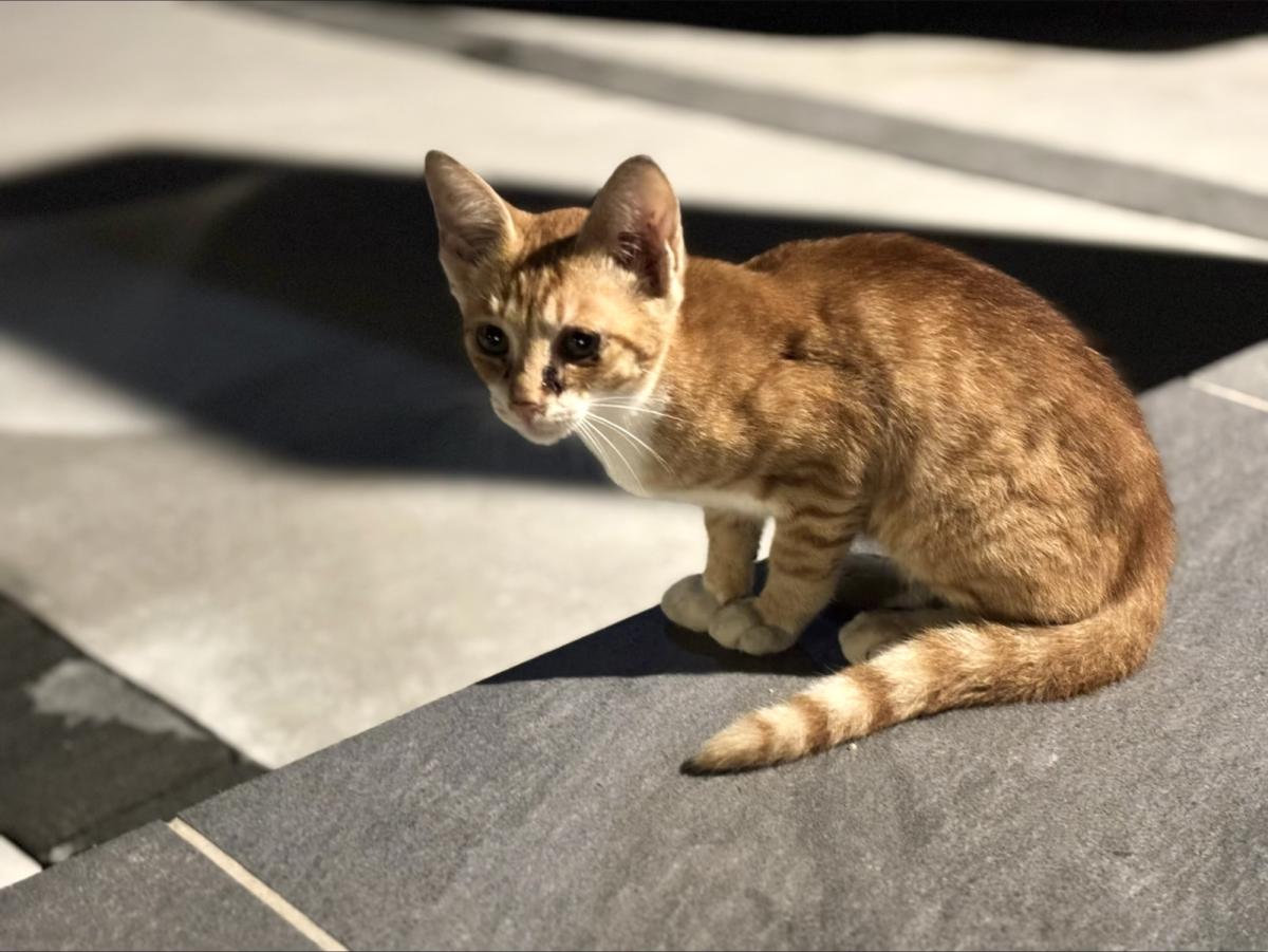 - キジトラ(焦茶)尻尾が長くて痩せています