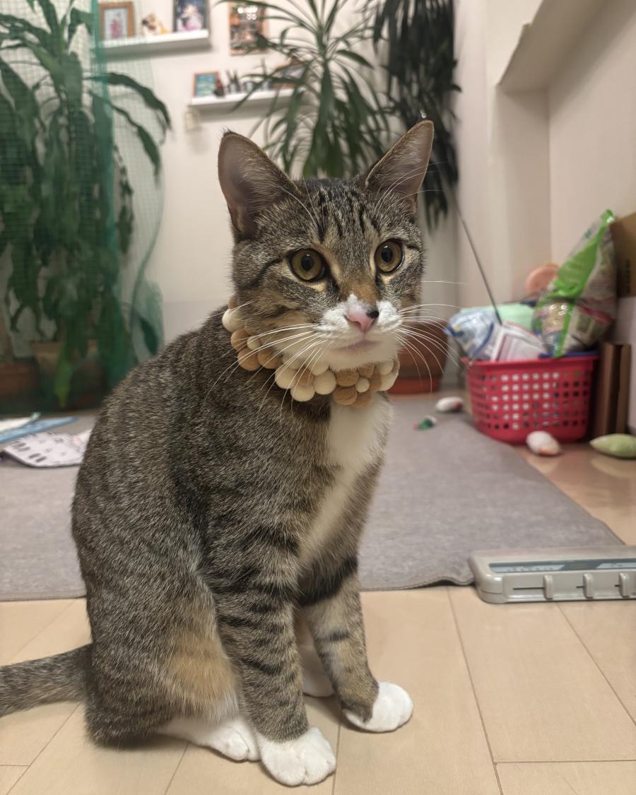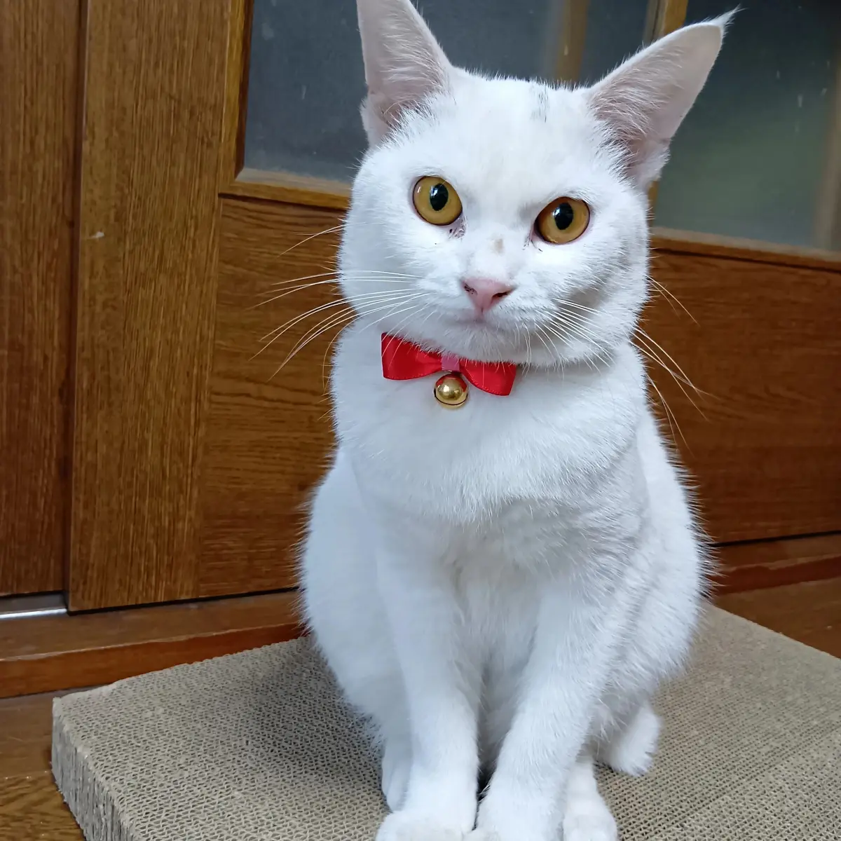 - しっぽは短めかぎしっぽ、赤いリボンの首輪をしています