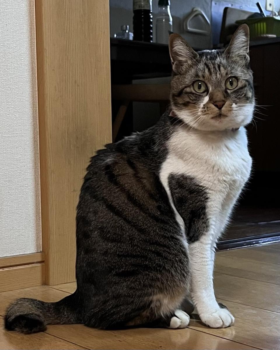 - かぎしっぽで左前足に黒く模様があります
