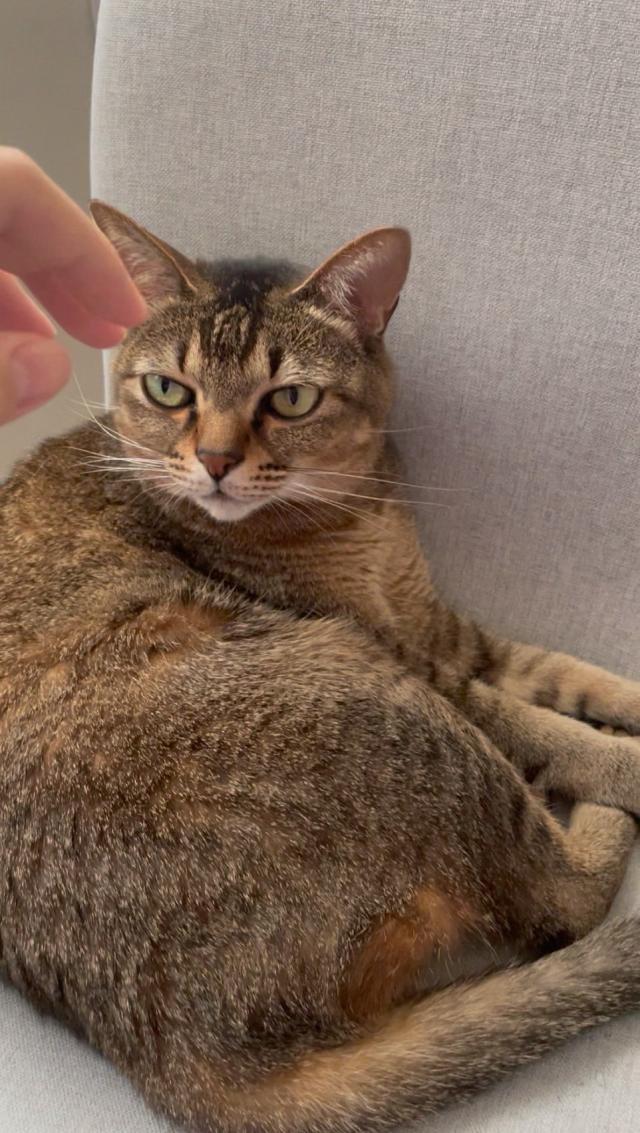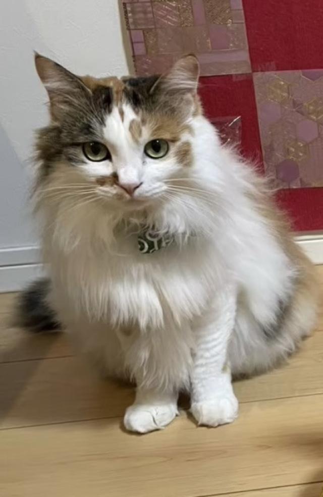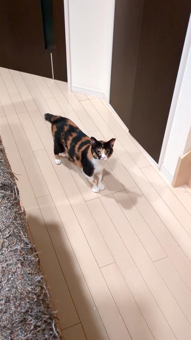 - はっきりした色の三毛猫で尻尾が短いです。