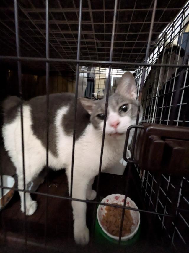 - 白とグレーの毛色、鼻がピンク、雄ですが耳カットが左に桜カット、左足怪我してます、長い尻尾で先が鍵しっぽ