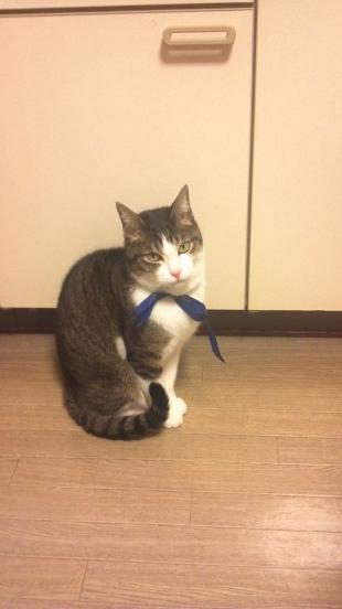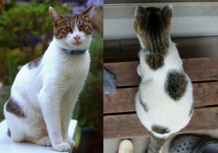 - オス去勢済で、しろとくろ、しっぽが短い。首輪にピンクのお守り。