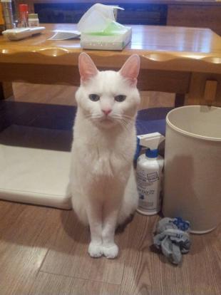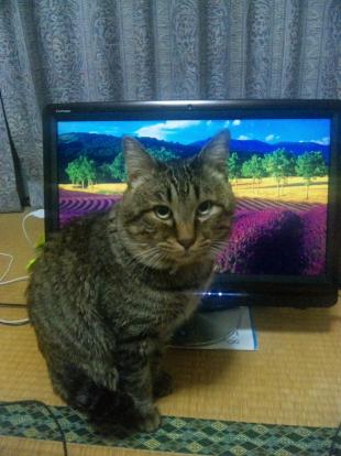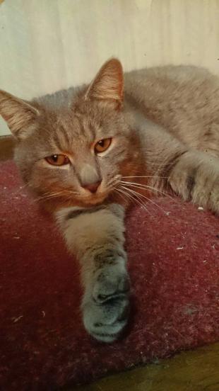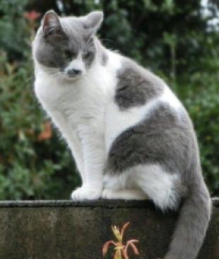 - 茶色のキジトラで白い首輪をし、歩く時に少しびっこを引いています