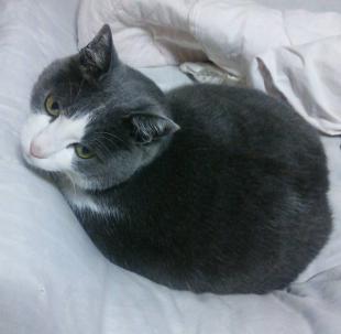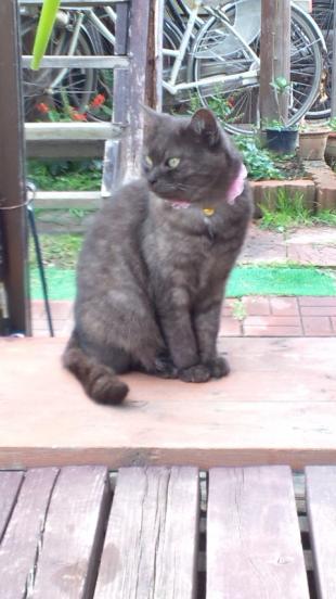 - 顔とシッポがミケ 他の部分は白 首輪はビニール製でピンク色