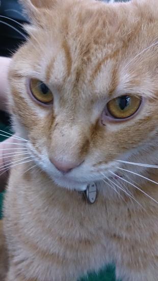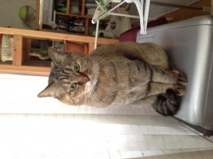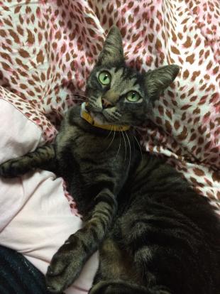 - メス 10歳 茶と黒のキジトラ 尾長 黄緑色の首輪