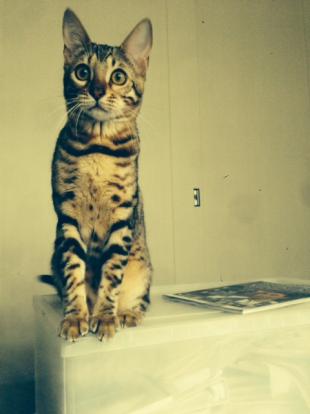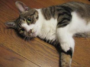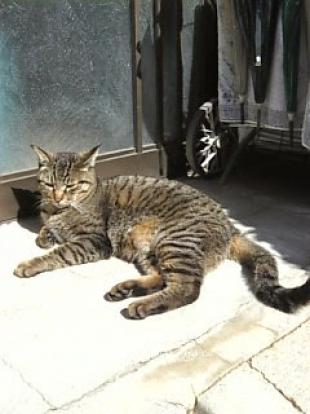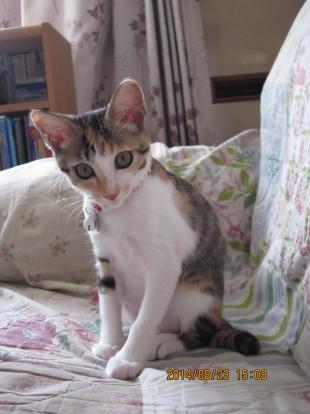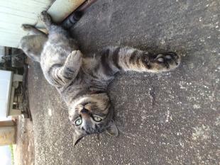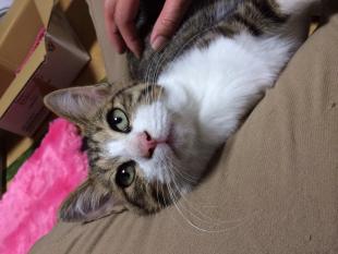 - キジトラと三毛の混ざった毛色。胸腹は白。