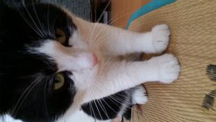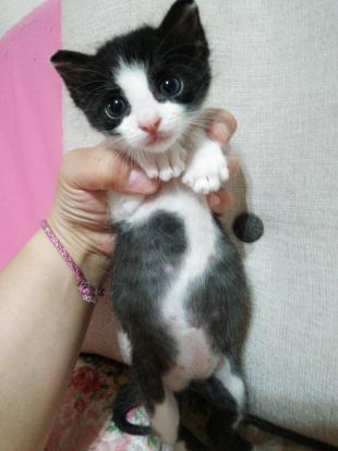 - 生後2ヶ月、白黒のオス、アメリカンな柄の首輪、リボン、鈴付きをしてます。