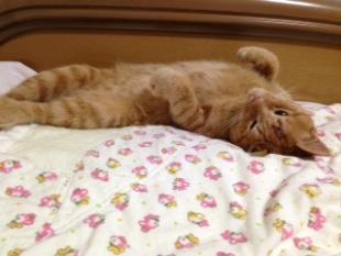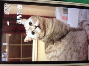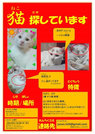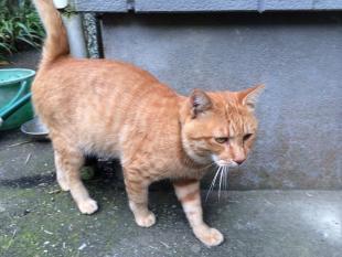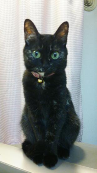 - 三毛猫、赤と白のドット柄の首輪をしている。