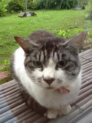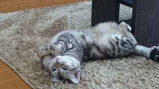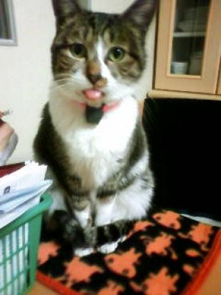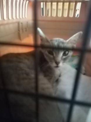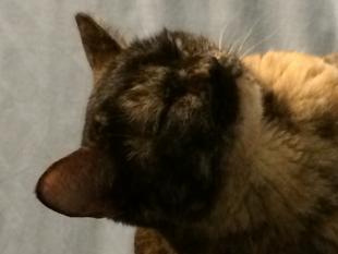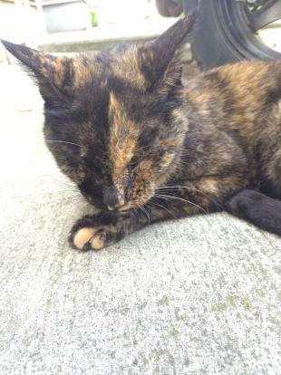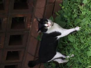 - サバトラで犬歯が一本しか残っておらず尻尾の先が曲がっています。お腹の皮もたるんでいます。