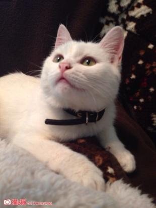 - 白い毛に黒い首輪をつけています。