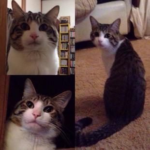 - 黒のキジ柄。去勢済みのオス。見た目は小太りで、目のななめ下にかさぶたの取れた跡があって少し禿げてます。尻尾は長くて先が鍵になってます。