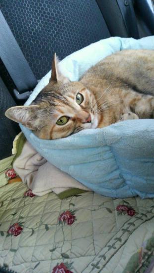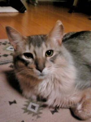 - 茶、白、黒の三毛猫。瞳の色グリーン。赤い首輪