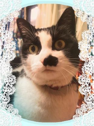 - 白黒で体の小さめなメス猫です。赤い首輪をしています。
