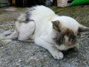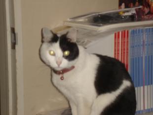 - 色は白と黒で古い色あせた首輪に鈴。太っている。