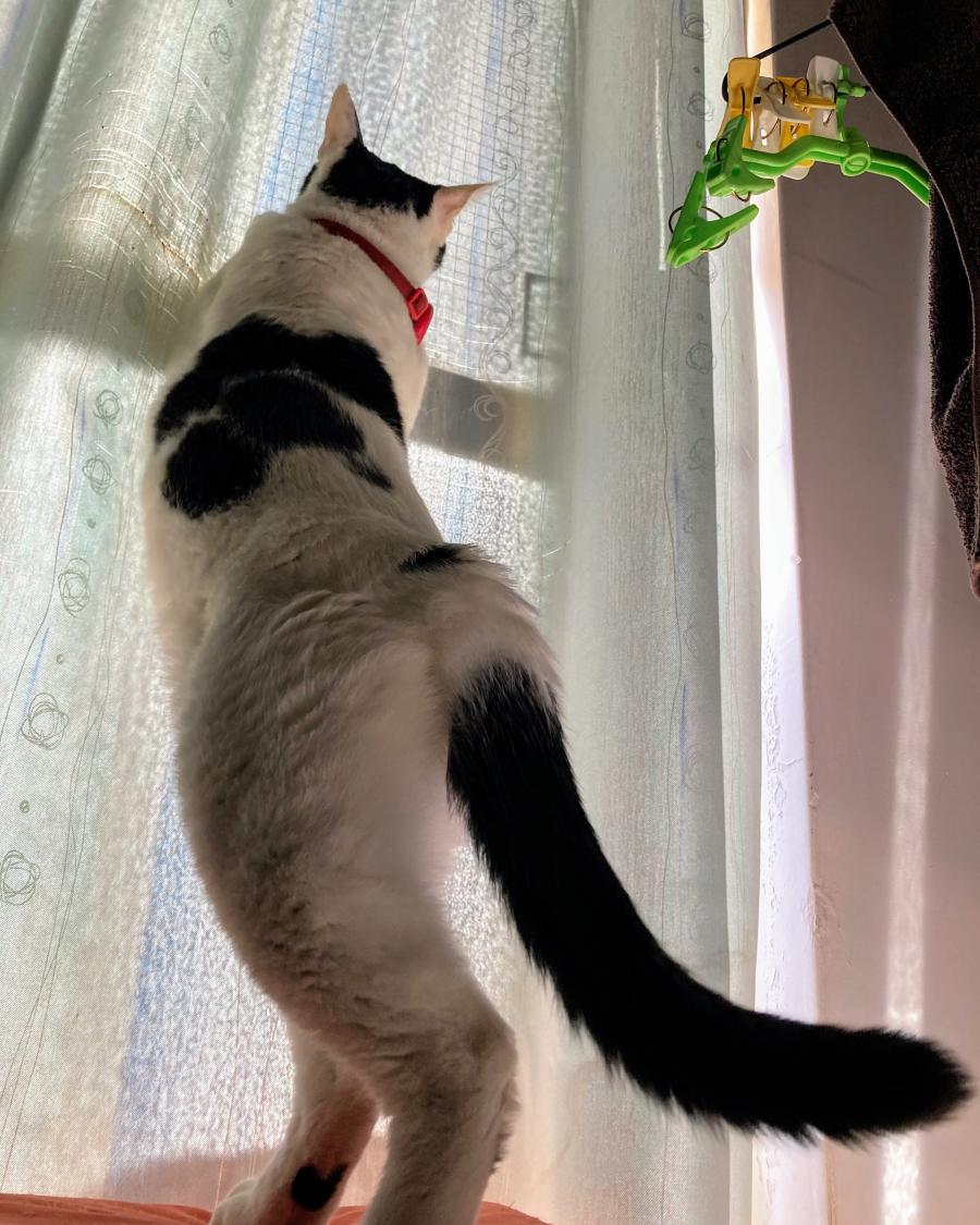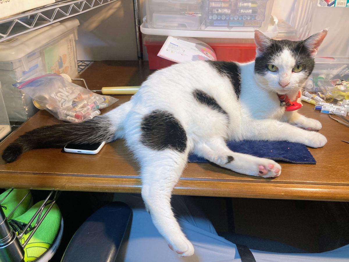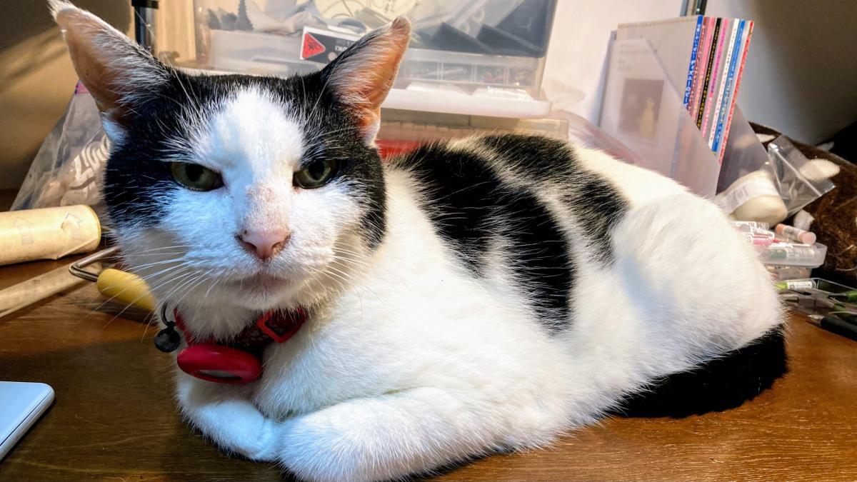 - 白地に黒の広めのハチワレでほんの少し耳カット
