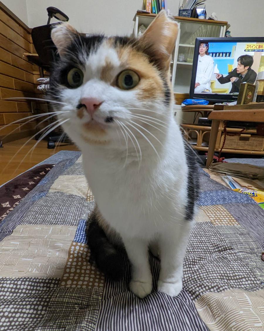 - 濃い色の三毛で黒と茶のはちわれ、耳カット
