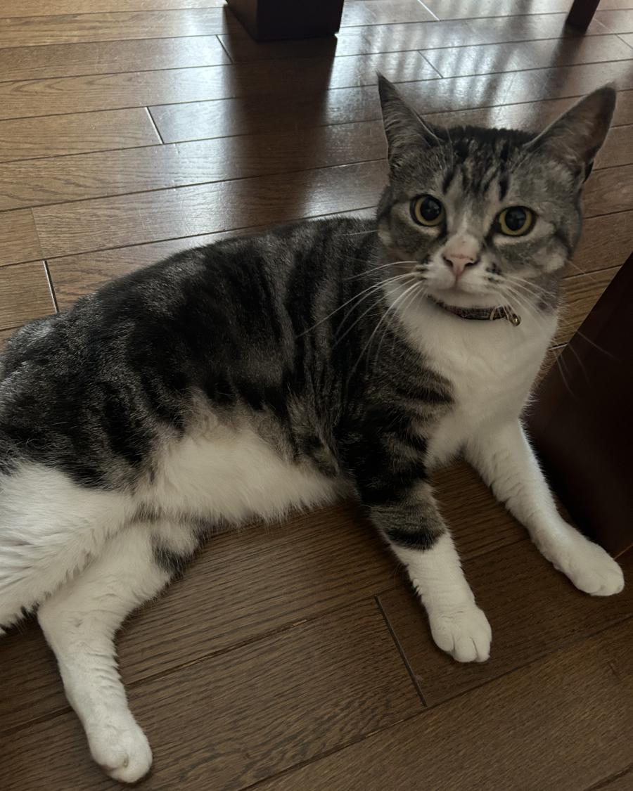 - 渦巻き模様のグレー白 足とお腹は白 脇腹に黒い渦巻き模様