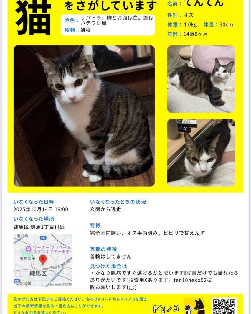 迷子猫情報 探しています2025-10-16 18:05:33 投稿者 やちまる さん 迷子になった猫のお名前 てんてん ちゃん 迷子になった場所 東京都練馬区練馬 周辺 特徴 きじとら、胸とお腹は白、お顔はハチワレ風 迷子になった日時 2025/10/17 瞳の色 金色 身体の大きさ 推定4~5kg その他の特徴・備考 首輪なし、かなり臆病な為 声かけや、捕まえようとすると逃げるかもしれないので、見守りつつ写真をとって情報の提供をお願いします 閲覧者へ向けてのメッセージ 些細な情報でも構いませんのでご連絡ください。 この情報を拡散する ポストする シェアする LINEを送る メールを送る このコメント欄をメールで受け取る コメントフォーム お名前※必須 メールアドレス※本記事の投稿者(xxxxx さん)にのみ公開されます。 画像 タイトル※必須 メッセージ※必須 ※投稿後は編集・削除はできません。よくご確認の上、投稿して下さい。