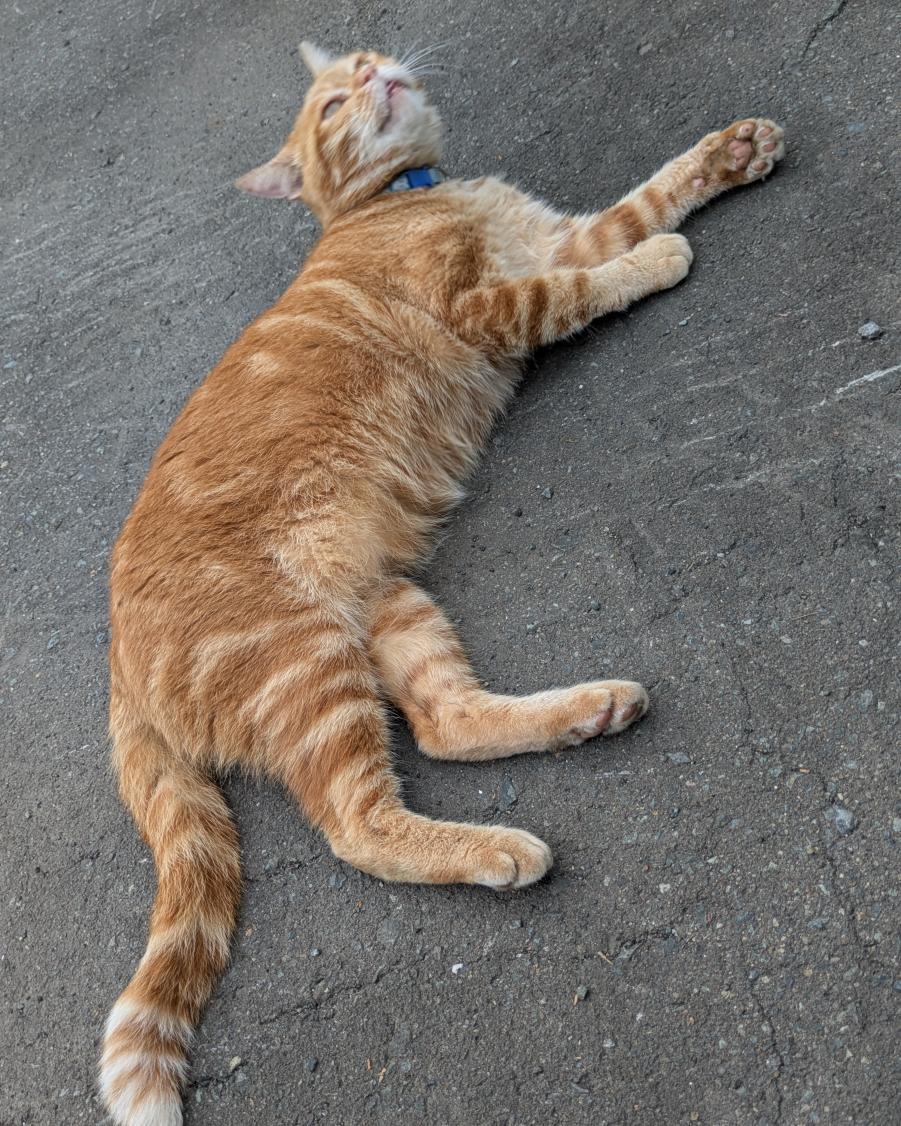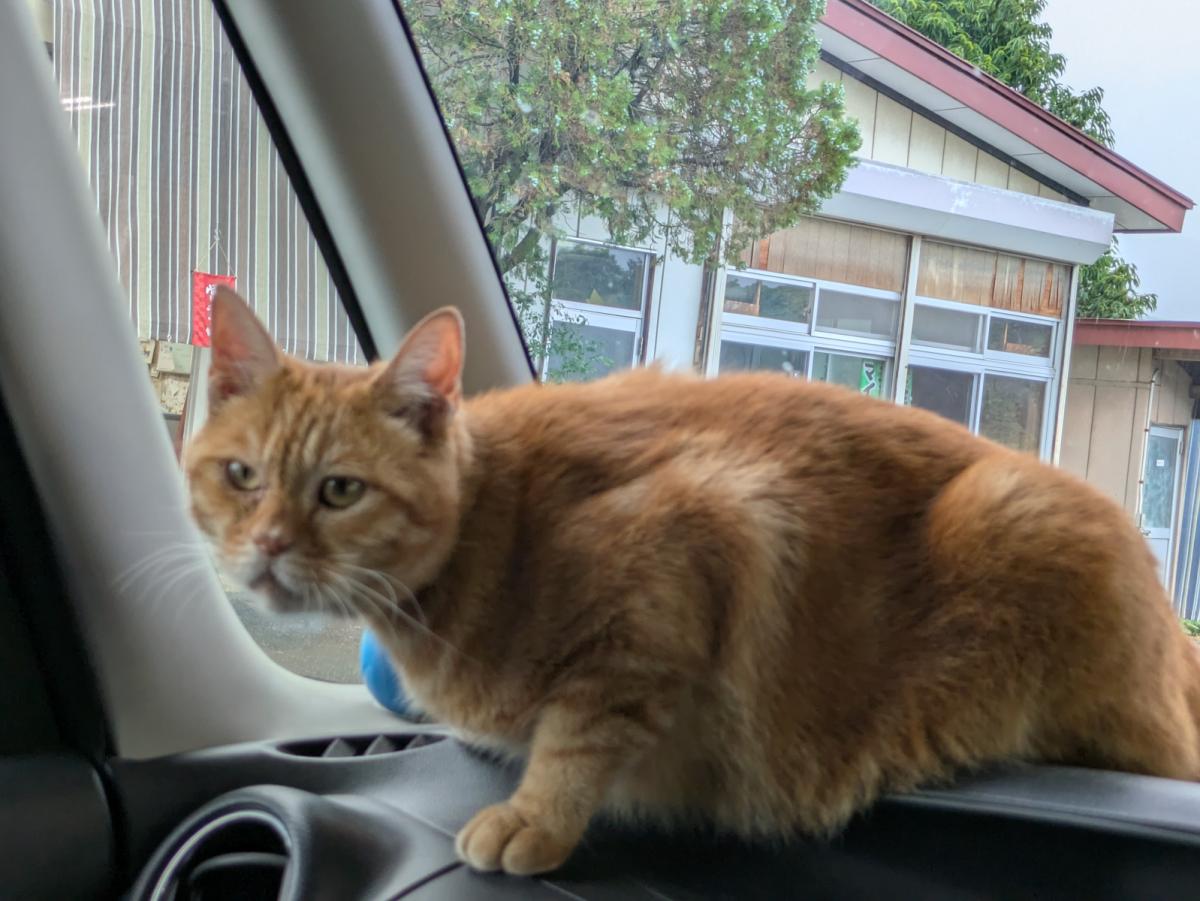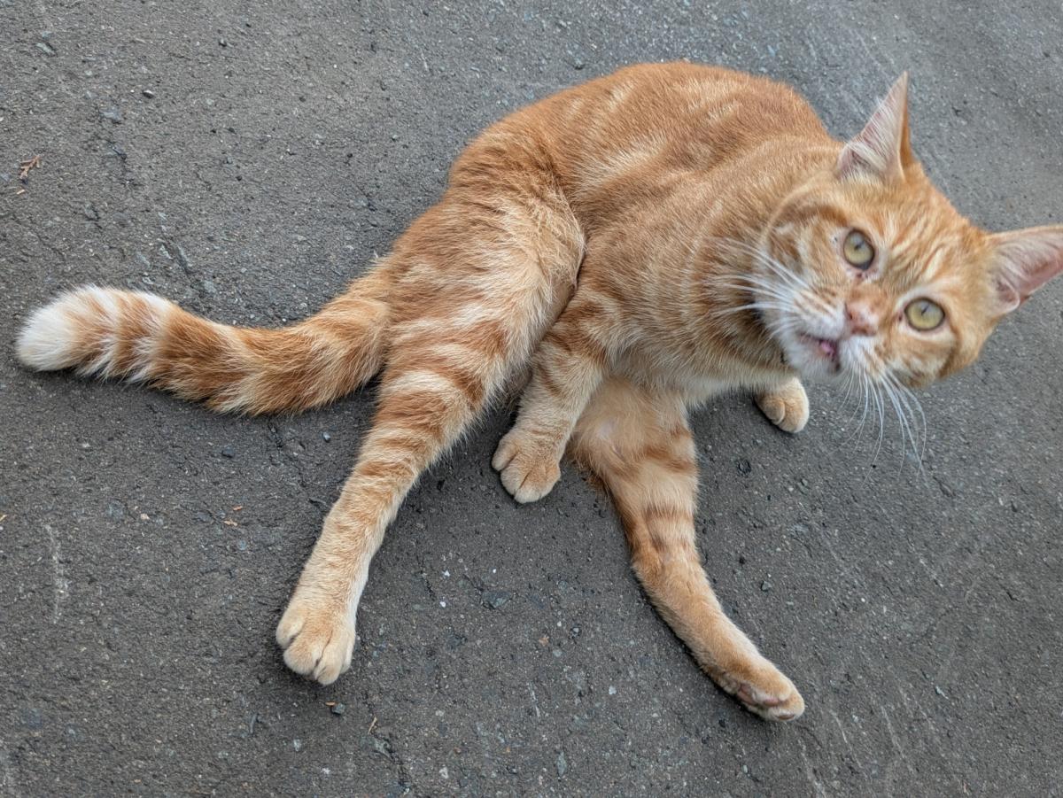 - 人懐っこい猫です茶トラ柄の顔で水色と青色の入った首輪をしています。。首が少し曲がっていて歩くとき首を傾げて歩きます。去勢済みです。車に乗るのが大好きで特に軽トラックの荷台がお気に入りです。