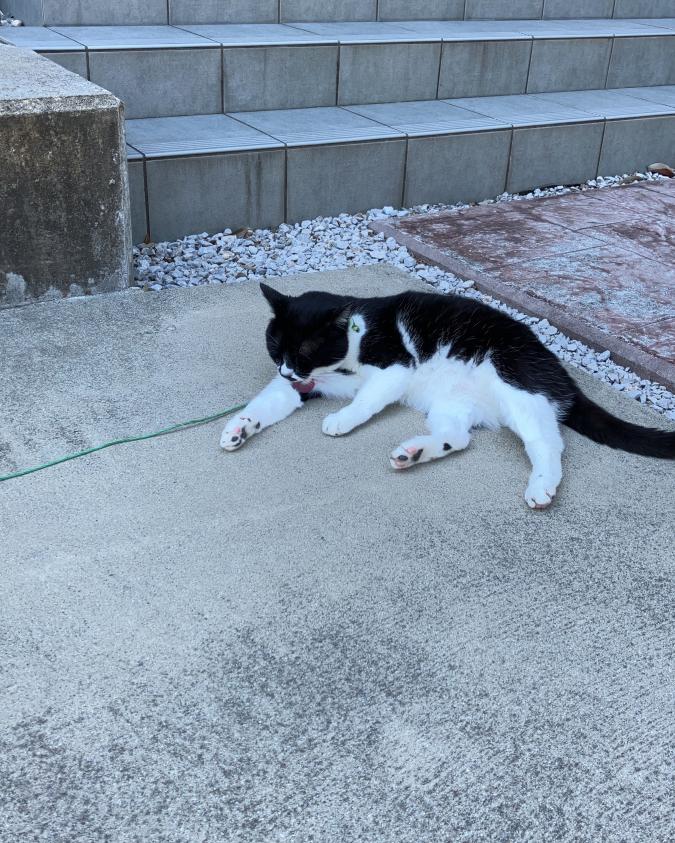 - ダニ防止の首輪(ピンクと白)と緑色の猫の足跡の模様の首輪をしています。緑の首輪に緑の紐をつけて庭で外に出していましたが家のドアに括りつけたはずの紐が外れていてそのまま敷地外に出てしまいました。紐がそのまま付いたままか、自力で首輪ごと外している可能性もあります