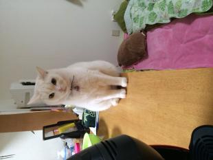- 白猫で目の色が左右違います。しっぽがやや短め、紫の首輪と鈴をつけてます。あまりなつきません。