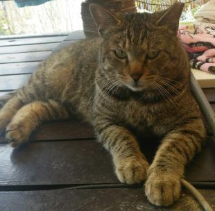 - キジトラ、緑色の目、かぎしっぽ、大きい体格